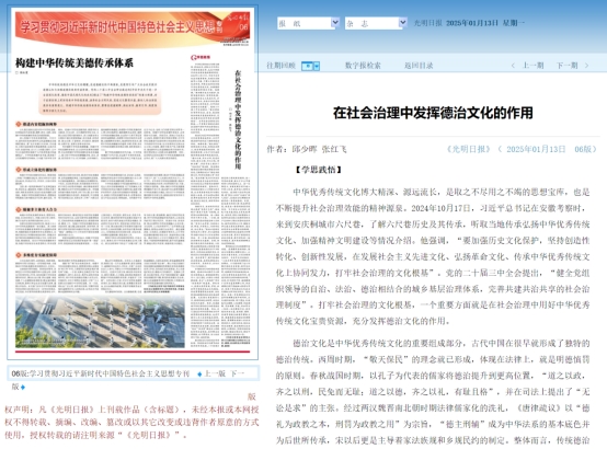 由bevitor伟德国际1946副院长邱少晖教授、伟德国际1946bv党委常委张红飞教授联合撰写的《在社会治理中发挥德治文化的作用》一文在《光明日报》发表。文章指出,中华优秀传统文化是社会治理的关键精神源泉,德治文化作为其重要部分,在社会治理中地位突出。