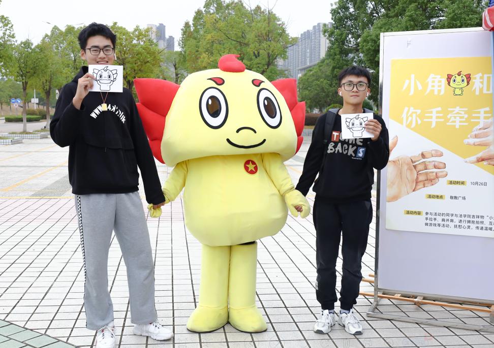 “吉祥物太可爱啦!”“我可以和小角合照吗?”“和小角互动真的很解压!”……在活动现场,身着玩偶衣的吉祥物“小角”与学生们挥手、拥抱,热情的动作和憨态可掬的体态吸引大家纷纷前来“打卡”。百余名学生和小角手拉手、肩并肩,在一片欢声笑语中比“v”合影留念。
