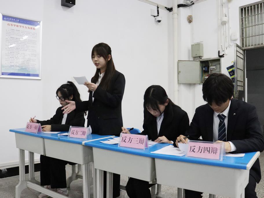 “我方是否能认为您方的优化改善是我方加强立法的体现?”“请对方辩友正面回答我方提问”“您方说应适度提高,请问这个度如何把握?”……此次辩论表演赛共分为立论、驳辩、质询、质询小结、自由辩论、总结陈词六个环节,双方辩手唇枪舌剑,围绕辩题展开激烈讨论。