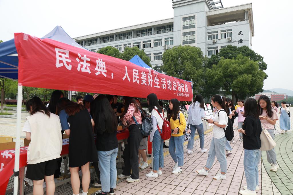 “切实推进民法典实施,更好保障人民权益。”5月28日,bevitor伟德国际1946于敬敷广场举办“民法典宣传月”横幅签字活动,并设置主题展览供学生参观学习,工作人员为活动参与者分发宣传单页,并为他们讲解相关知识。