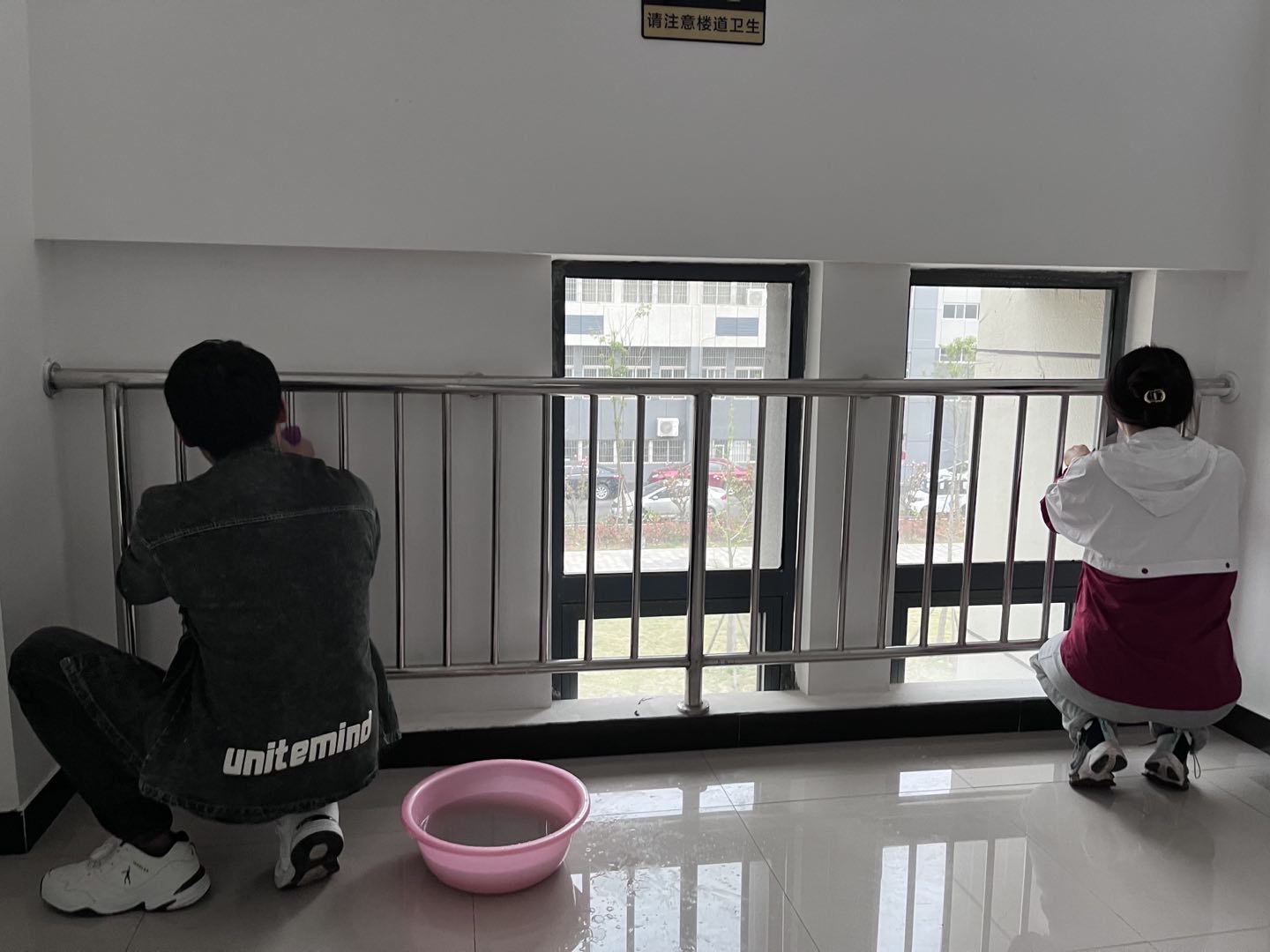 “看着通过自己双手让我们学院的新楼焕然一新,真的很自豪,擦玻璃时候有人帮忙换水,拧毛巾,大家互相帮助,虽然事情很简单,但在劳动的过程中彼此的互助让我收获满满的感动。”“聚力”学生党员服务工作站何霓同学说道。
