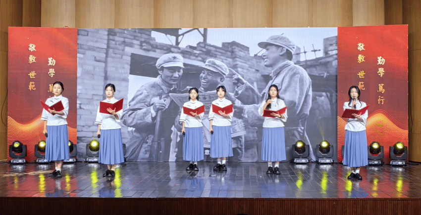 黄梅戏《木兰从军》中的优美唱腔和舞台身段相结合,表演者身着红色盔甲,手持旌节与红缨枪,英姿飒爽;学院主持队带来的诗朗诵《英雄》激情澎湃,字句间处处抒发着爱国之情;好果汁乐队带来的歌曲串烧《你要跳舞吗》《再飞行》热情向上、动感十足,点燃了现场的氛围;民乐合奏《恭喜发财》欢快流畅,彰显了流传千年独属于中华民族的音乐之美……