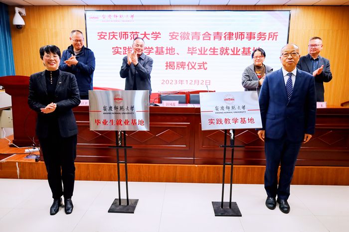 彭凤莲和音邦定共同为法学实践教学和毕业生就业基地揭牌,bevitor伟德国际1946负责人和安徽青合青律师事务所合伙人签订法学实践教学、毕业生就业基地协议。
