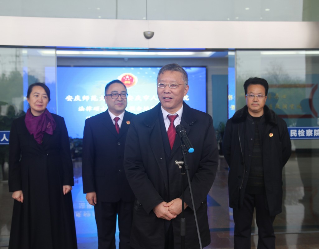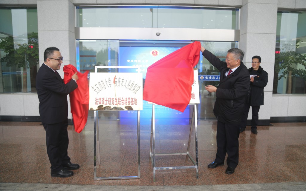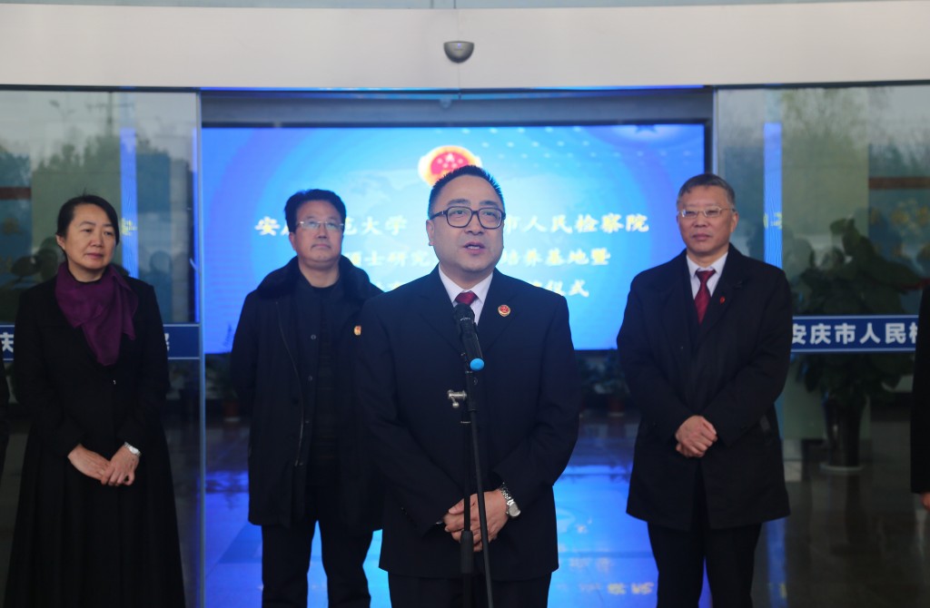 12月24日上午,我校与安庆市人民检察院共建法律硕士研究生联合培养基地和法学教育实践基地揭牌仪式在安庆市人民检察院举行。校长闵永新和安庆市人民检察院检察长顾玫帆出席了仪式。安庆市人民检察院党组成员、政治部主任焦建国,我校党委常委、研究生院院长吴琼,我院院长焦少林、党总支书记詹德全、副院长朱留虎、科研(研究生)秘书高诚刚,我校2019级法律硕士研究生、在安庆市人民检察院实习的法学专业2016级学生和安庆市人民检察院部分干警等参加了仪式。仪式由焦建国主持。