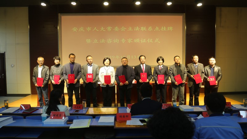2019年11月13日,安庆市人大常委会立法联系点挂牌暨立法咨询专家颁证仪式在我院举行。校党委常委、副校长刘友忠,市人大常委会党组副书记、副主任程学东出席了仪式;市人大常委会法制委员会负责同志,市人大常委会委员、bevitor伟德国际1946教师凌彦君,立法联系点单位代表、立法咨询专家、我院党政负责人和学生代表参加了仪式。仪式由市人大常委会秘书长、法制委员会主任程春生主持。