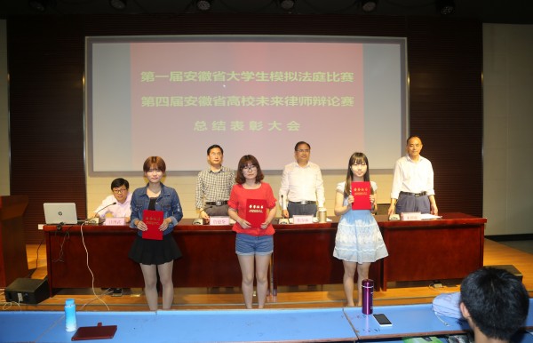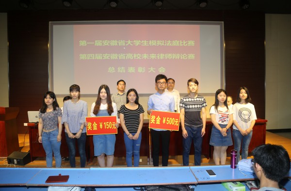 与会领导为在省级和校级未来律师辩论赛、模拟法庭大赛中取得优异成绩的团体和个人颁奖。