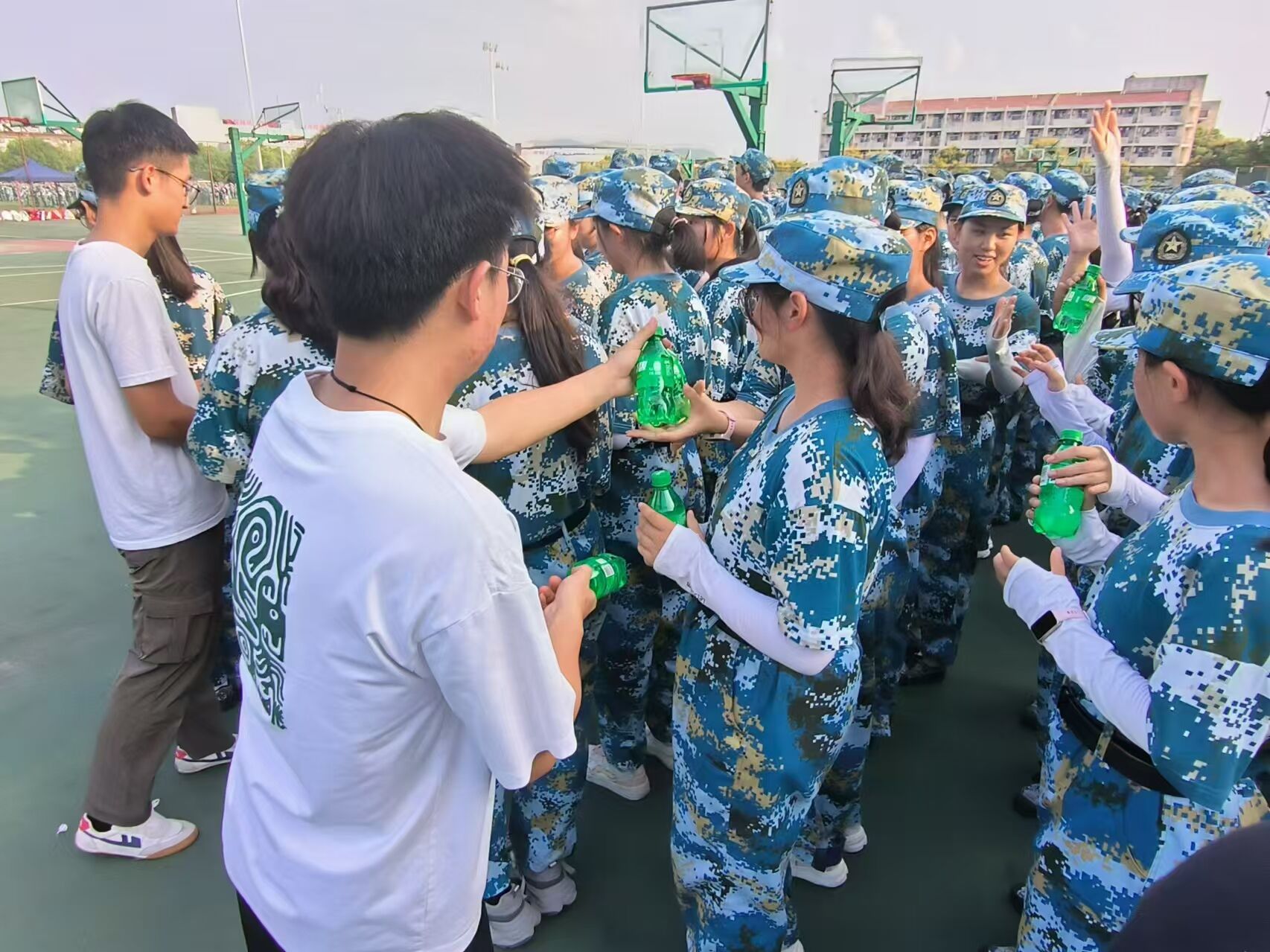 学生会成员们在老师们的带领下,为新生们带来了解暑饮品、清凉水果等精心准备的慰问品,让新生们在紧张的训练之余感受到了来自学院的关怀和温暖。