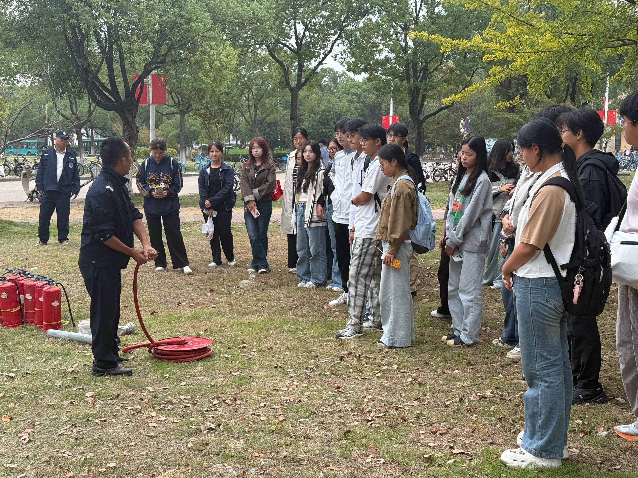理论宣讲后,工作人员带领学生开展消防技能培训,分组有序进行实操演练,亲身体验干粉灭火器灭火过程。演练过程中,同学们态度认真、行动迅速,严格按照操作规范完成各项任务,有效掌握了消防应急处置技能。