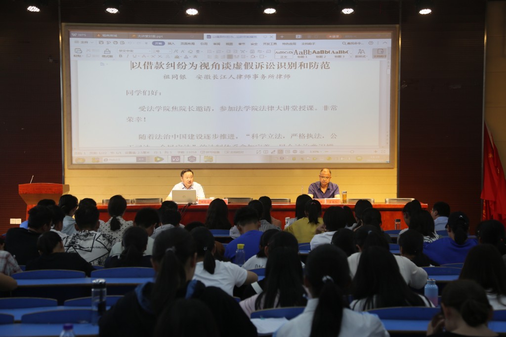 9月25日,安徽长江人律师事务所祖同银律师应邀莅临法律实务大讲堂,以“以借款纠纷为视角谈虚假诉讼识别和防范”为题作专题讲座。bevitor伟德国际1946部分教师、全体2019级法律硕士研究生和2018级部分本科生共160余人聆听了报告。院长焦少林教授主持了讲座。