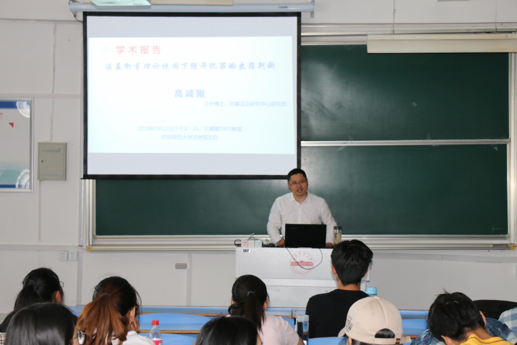 5月22日下午,我院高诚刚博士在龙山校区文津楼D405教室开展了题为“法益衡量理论视阈下经济犯罪的出罪判断”的学术讲座,2018级法学(1)班、(4)班和2018级知识产权专业共100余名同学聆听了报告。