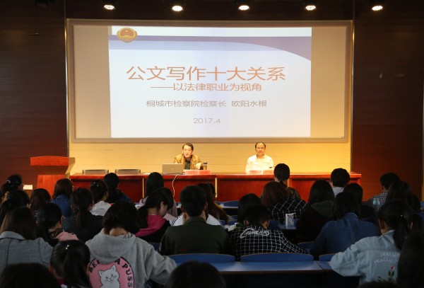 4月26日桐城市人民检察院党组书记、检察长,我校兼职副教授欧阳水根应邀莅临法律实务大讲堂,以“公文写作十大关系——以法律职业为视角”为题作专题讲座,我院院长焦少林教授主持报告会,法学专业2015、2016级本科生100多人参加。